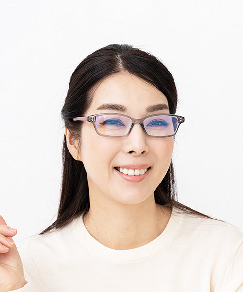 レンズは、ブルーライトをカットする“PC対応レンズ”を採用。日本産業規格(JIS T 7333:2018)で、ブルーライトを約20%以上カット。また、紫外線も99%以上カットし、ARコート(反射防止コーティング)もほどこしました。