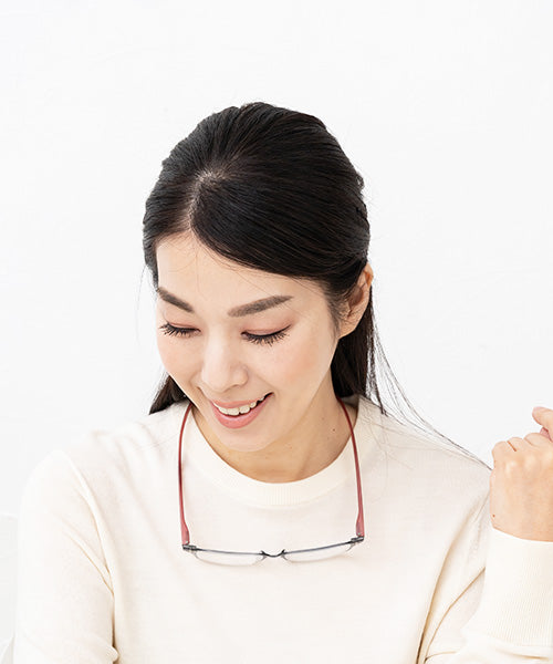 ショッピングや旅行のお供に。使わない時はサッと首元へ。もうどこへ置いた、忘れた、とあちこち探す必要はありません。使いたい時に首元からスマートにご着用いただける新感覚のリーディンググラスです。